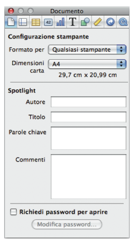 Nei fogli di calcolo di Numbers, è possibile memorizzare varie informazioni, quali il nome dell'autore e le parole chiave, quindi utilizzare Spotlight per trovare i fogli di calcolo che contengono tali informazioni.