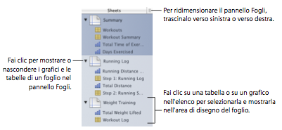 I fogli presenti in un foglio di calcolo e le tabelle e i grafici di ogni foglio sono rappresentati nel pannello Fogli, lungo il lato sinistro della finestra.