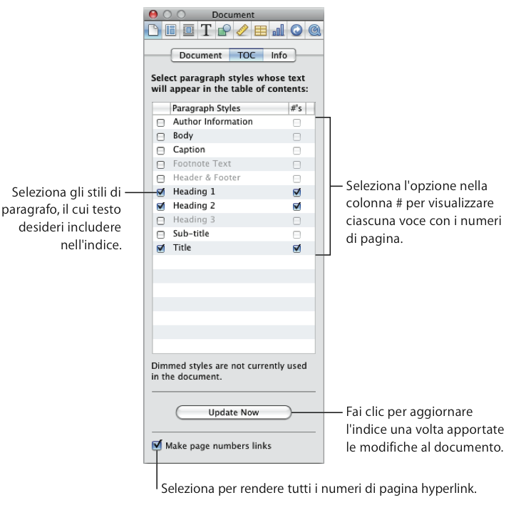 è vuoto. Se selezioni gli stili utilizzati di frequente nel documento, l'indice potrebbe risultare più lungo del necessario. - Nella colonna #, seleziona le opzioni degli stili nelle cui voci desideri includere un numero di pagina.