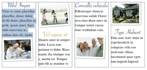 I modelli contengono testo segnaposto, che mostra quale sarà l'aspetto del testo e dove verrà posizionato nel documento finito. Gran parte del testo segnaposto relativo al corpo del documento, alle caselle di testo, alle intestazioni e ad altro compare il latino, ad esempio lorem ipsum. Altre parti di testo predefinito, ad esempio il titolo di una newsletter, vengono visualizzate nella lingua in uso.