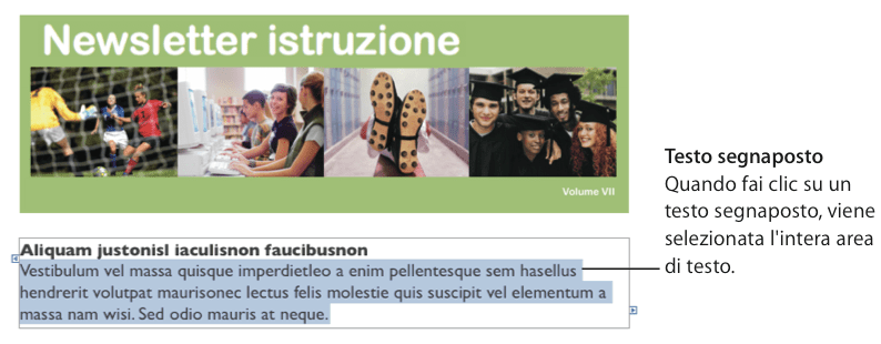 La casella di testo e il testo segnaposto sono parti della struttura di default del modello. Per mantenere invariata la struttura, fai attenzione a non premere Cancella dopo avere selezionato la casella di testo o la tabella, altrimenti rimuoverai il segnaposto dalla pagina. Se involontariamente elimini una casella di testo o una tabella, premi Comando-Z (l'abbreviazione per il comando Annulla).