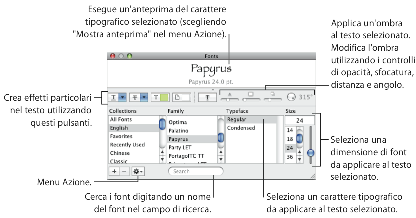 Se i pulsanti per gli effetti di testo non vengono visualizzati, scegli Mostra effetti dal menu a comparsa Azione nell'angolo inferiore sinistro della finestra Font.