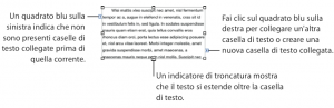 - Per collegare un'altra casella di testo o creare una casella di testo collegata, fai clic sul quadrato blu sul lato destro della casella di testo, quindi su un'altra casella di testo o in un qualsiasi punto della pagina (oppure scegli Formato > Casella di testo > Aggiungi casella di testo collegata). Per annullare il collegamento, premi Esc. La nuova casella di testo ha un quadrato blu pieno sul lato sinistro. Questo indica che la casella di testo è collegata a un'altra casella precedente.