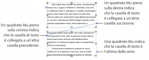le modifiche eseguite vengono applicate anche al testo presente nella casella di testo collegata. Le caselle di testo collegate possono essere inserite in posizioni separate nel documento.