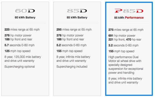 All-wheel-drive quindi come potete vedere nella tabella qui sotto con le versioni, sempre tre. La 60D, la 85D e la P85D (P qui sta per Performance) che regalano una maggiore efficienza. E il top di gamma permette un’accelerazione da 0 a 96 km/h in soli 3”2. Dato da supercar assoluta.