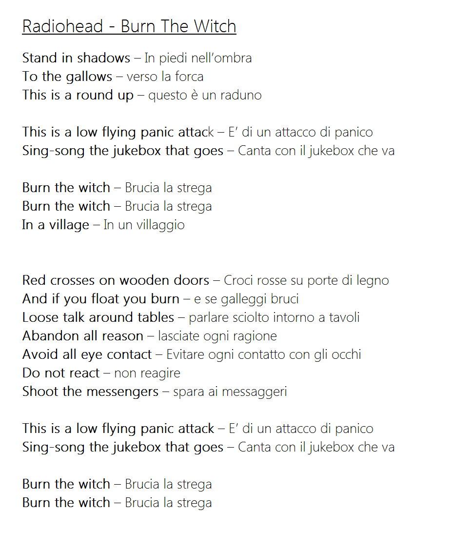 Testo completo, parole e traduzione italiana canzone Radiohead, Burn The Witch. Radiohead, Burn The Witch Testo e traduzione italiana. Radiohead, Burn The Witch: testo e traduzione completa