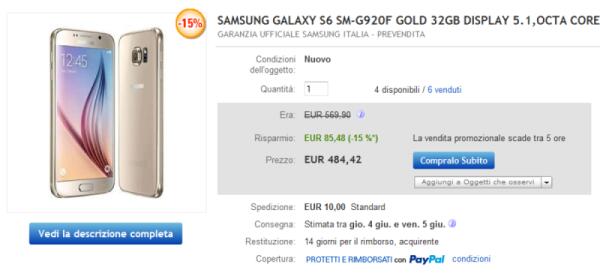 Super Offerta Samsung Galaxy S6 Gold Italia a soli 485 euro con spedizione inclusa
