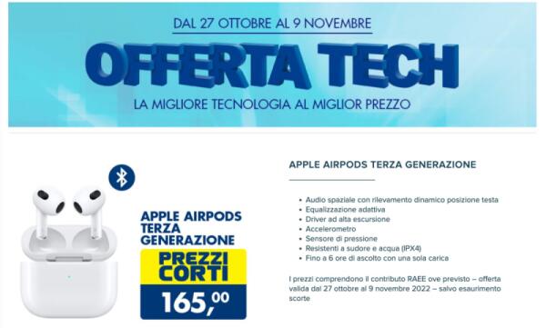 Le cuffie Apple AirPods 3 sono in OFFERTA da Esselunga a 165 euro