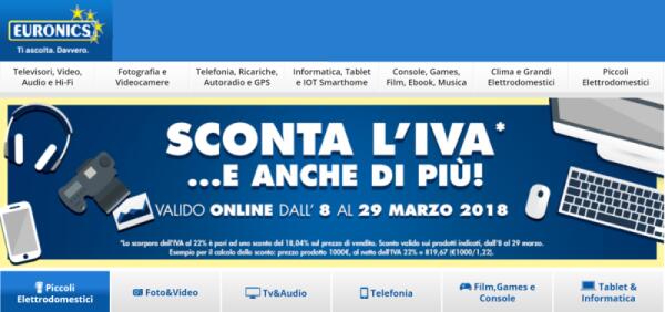 Euronics SCONTA L'IVA anche Online fino al 29 Marzo