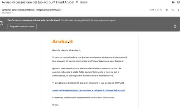 Avviso di cessazione del tuo account Email Aruba - TRUFFA