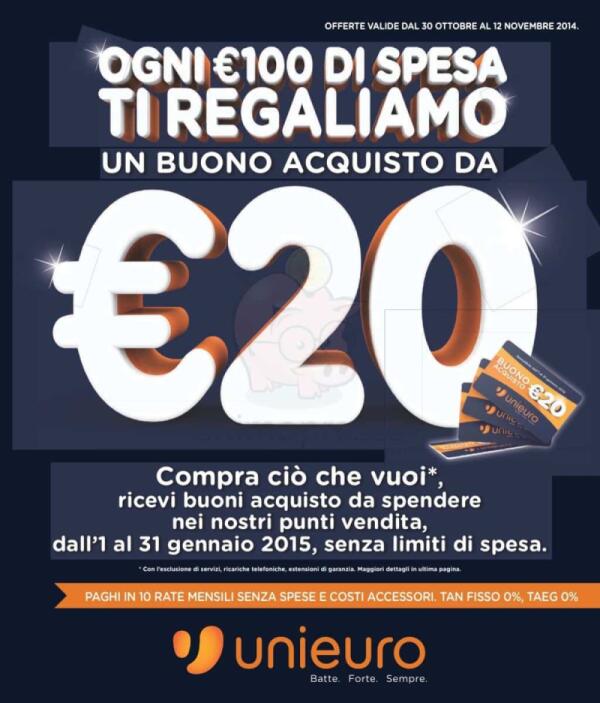 Unieuro regala un Buono da 20 € ogni 100 € di spesa: Ultimo Volantino Unieuro