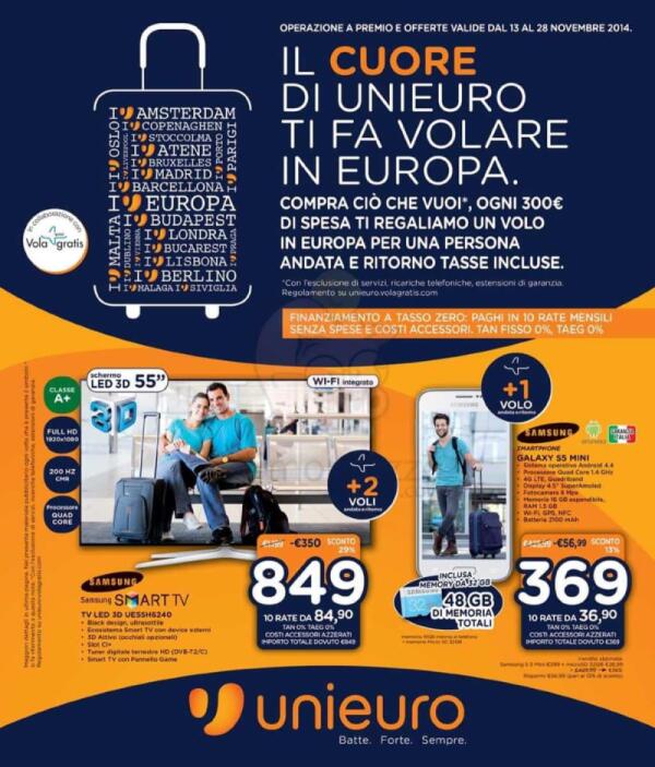 Volantino Unieuro: Per ogni 300 euro di spesa in regalo un volo in Europa A/R