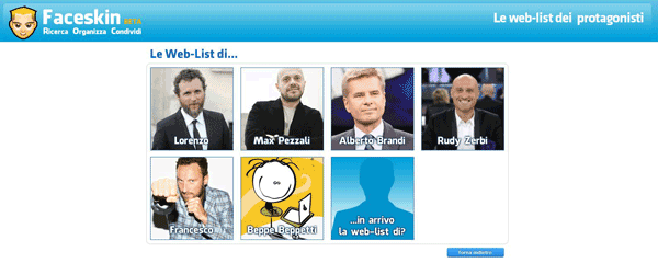 Sono più di 15000 gli utenti iscritti a Faceskin, incuriositi abbiamo dato uno sguardo a questo nuovo social network, a detta di molti è stato battezzato come "innovativo" , consente di condividere pubblicamente le proprie pagine web di interesse inserite all'interno di una weblist suddividendole per argomento; a contribuire al progetto volti noti come Jovanotti, Fiorello, Max Pezzali e Linus che hanno dato vita ai primi album di contenuti da visualizzare.