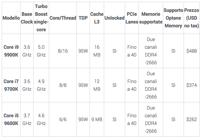 Intel Core di nona generazione ufficiali, c'è il Core i9 9900K a 8 core. Tutto quello che devi sapere sui processori Intel Intel I9-9900K, I7-9700K, I5-9600K