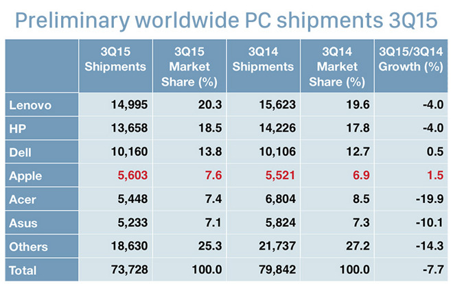 Nel mondo sono stati venduti ben 5,6 milioni di MAC ad agosto secondo i dati di Gartner con un 7,6% di market share mentre nel mondo dei PC tutti gli altri produttori segnano risultati negativi tranne Dell che è l'unica a tenere il passo di Apple. Lenovo è sempre in testa con 15 milioni di unità vendute con un market share del 20,3% perdendo però il 4%, mentre HP ha ancora un ottimo market share anche se perde sempre il 4% ed infine troviamo Acer e Asus in caduta libera del 19,9 e 10,1%. Dunque i PC segnano risultati negativi importanti che riflettono la sempre più alta domanda di smartphone e tablet.