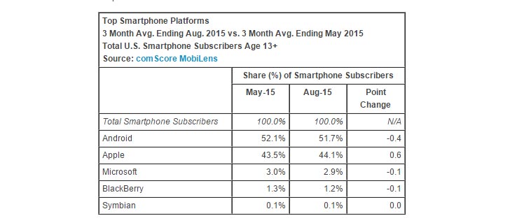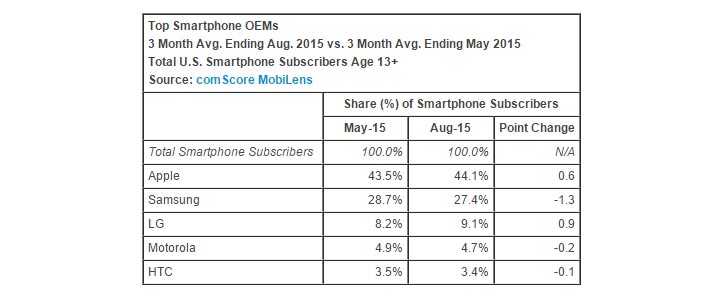 Passando al mondo mobile, i dati pubblicati da ComScore, mostrano come i due produttori maggiori siano sempre Apple e Samsung con LG, Motorola ed HTC fermi a guardare con le briciole del mercato sempre con dati riferiti al mercato USA ma che in linea generale riflettono quello mondiale con Samsung ed Apple a fronteggiarsi nei maggiori mercati mondiali.