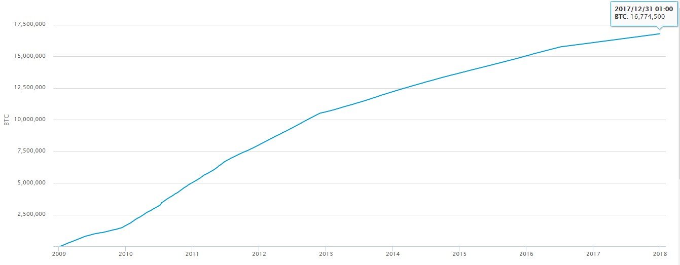 Andando aventi così ogni 4 anni la "ricompensa" diminuirà del 50% così che alla fine nel 2040 saranno terminati i Bitcoin che per un calcolo veloce significa che nel 2040 saranno generati tutti i 21 milioni di Bitcoin e che, come da grafico che trovate in apertura articolo, al 31 dicembre 2017 sono stati generati 16.774.500 milioni di Bitcoin.