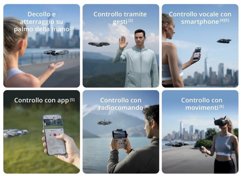 - Controlli supportati: gesti, comandi vocali, radiocomando DJI RC N3, motion controller, visore per esperienza FPV