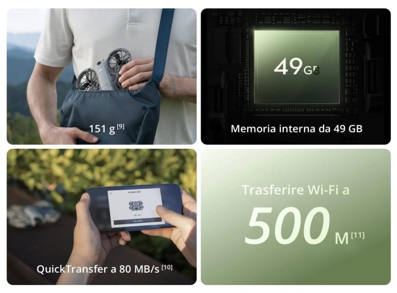 - Trasferimento dati: fino a 80 MB al secondo tramite app DJI Fly