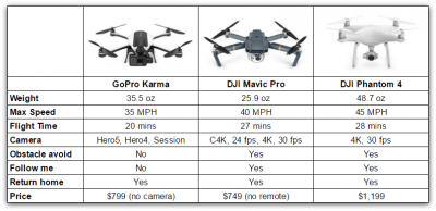 Iniziamo con una tabella che mette a confronto, nero su bianco, i due droni GoPro Karma e DJI Mavic Pro.