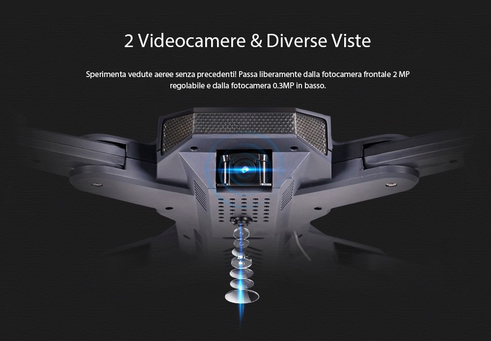 La principale novità offerta da TIANQU VISUO XS816 è rappresentata dalla presenza della doppia fotocamera, una delle quali funge da sensore per il volo indoor.