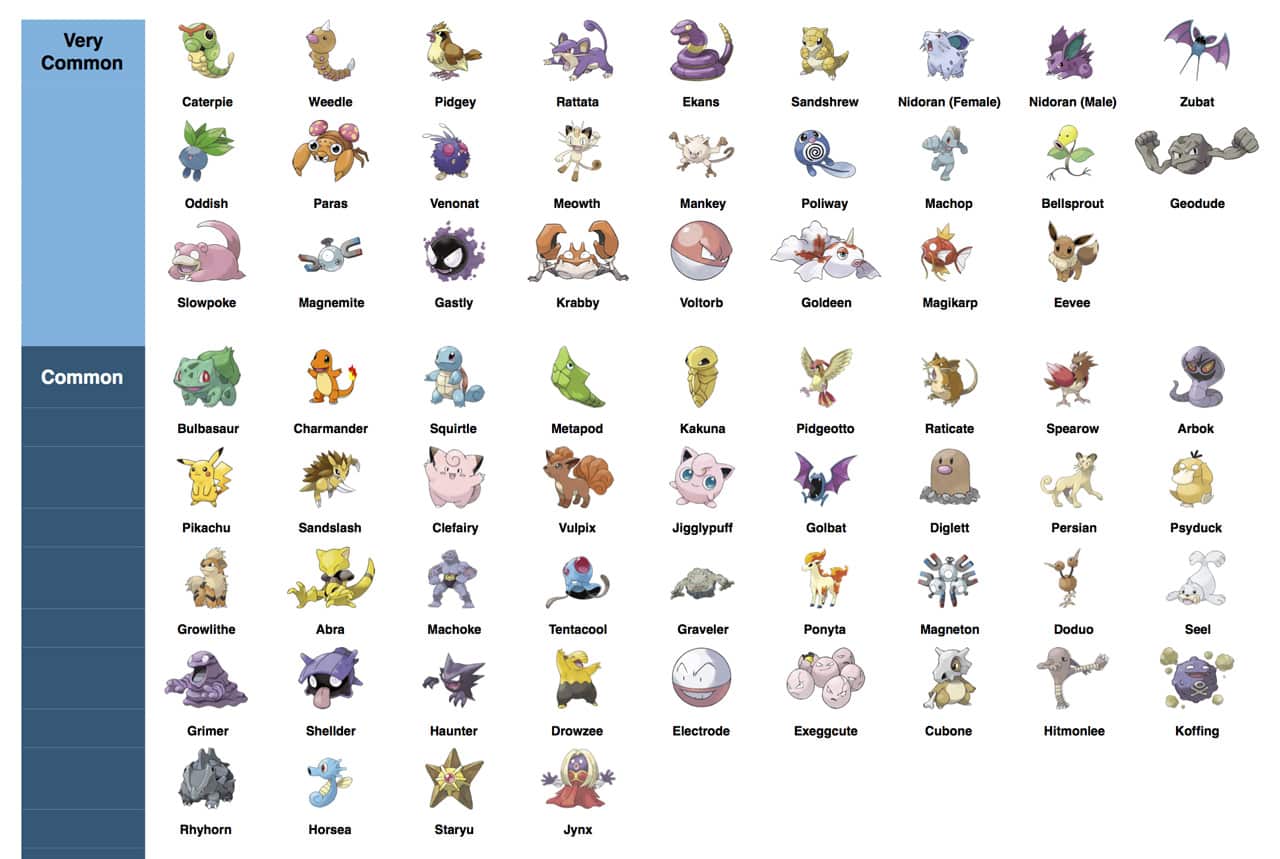 Di seguito potete trovare una tabella con tutti i nomi dei Pokemon di prima generazione presenti dentro Pokemon Go divisi per tipologia di rarità.