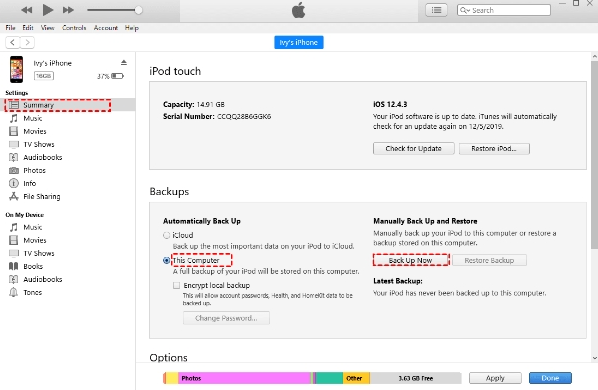 Passaggio 2. Fai clic sulla scheda Dispositivo e quindi vai su Riepilogo > Seleziona questo computer > Esegui backup adesso.