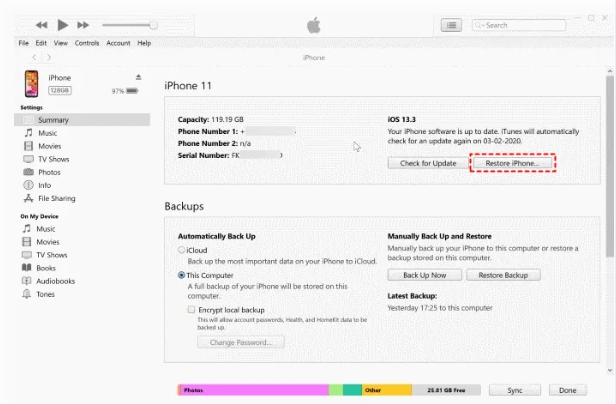 Un altro modo per disattivare la schermata SOS di emergenza è ripristinare il tuo iPhone utilizzando iTunes tramite il tuo computer. Prima di procedere con questo metodo, assicurati di eseguire un backup del dispositivo perchè potresti perdere i tuoi dati.