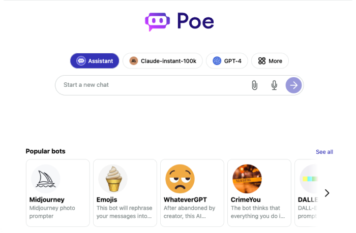 Lanciato nel 2023, Poe è un altro chatbot creato dalla rinomata azienda di tecnologia dell'informazione - Quora. La sua capacità di generare narrazioni e storie avvincenti è ciò in cui eccelle, rendendolo uno strumento ideale per scrittori, creatori di contenuti ed appassionati di narrazione.