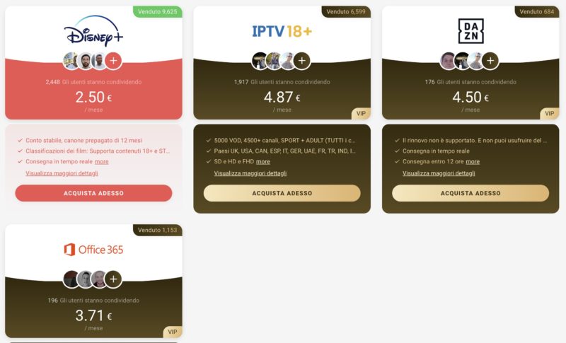 E' un sito web molto simile ad altri già noti ed utilizzati in Italia che permette di acquistare account condivisi ai principali servizi di streaming, risparmiando un sacco di soldi.