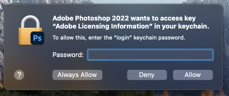 Hai appena installato un programma Adobe (Photoshop, Lightroom, Illustrator..) sul tuo Mac, ma questi programmi continuano a chiedere la password del Mac e l'accesso al portachiavi?