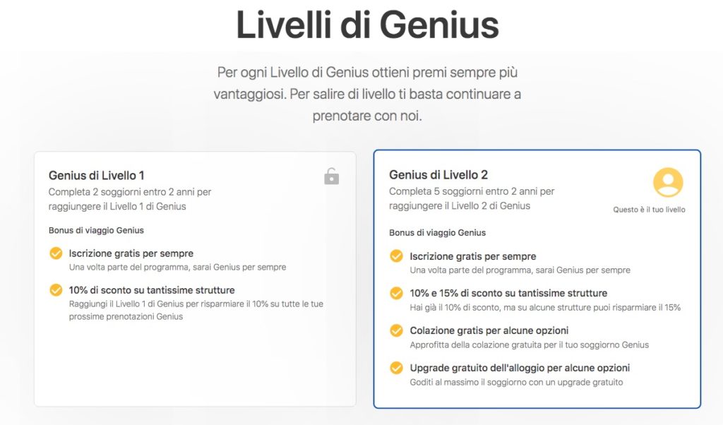 Ecco un breve riassunto che ti permette di capire cosa offrono i 2 livelli Genius di Booking (io sono al Livello 2).
