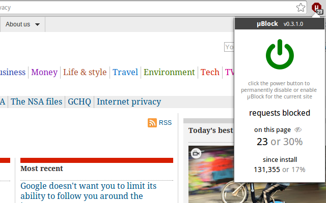 Il funzionamento di uBlock è estremamente simile ad AdBlock: non appena completata l’installazione, noterai che comparirà l’icona del programma nella barra delle estensioni di Chrome (in alto a destra). Cliccando sull'icona di uBlock potrai vedere nel dettaglio il numero di annunci e script indesiderati che sono stati bloccati su quella determinata pagina da uBlock. Molto carina questa parte riguardante le statistiche degli annunci bloccati su internet.