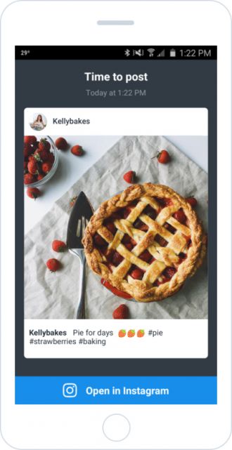 Una volta che un post sarà programmato, il dispositivo iOS, Android o web collegato a Buffer vedrà una notifica per farvi sapere quando il post è pronto per essere inviato manualmente. La notifica mostra anche un'anteprima del post e vi reindirizza dritti dritti a Instagram per poterlo inviare.