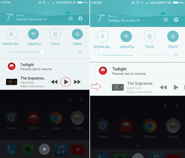 - ora trascina verso il basso la tendina delle notifiche o controlla la schermata delle notifiche del tuo smartphone: comparirà una sorta di player video che ti permetterà di mettere in pausa o di avviare la riproduzione del video di YouTube che stavi guardando in precedenza