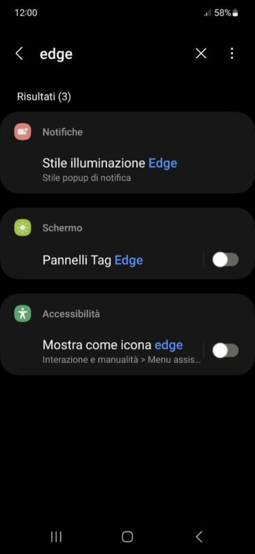 - Cerca la voce "Pannelli Tag Edge" e scegli se attivarli o meno, come da immagine