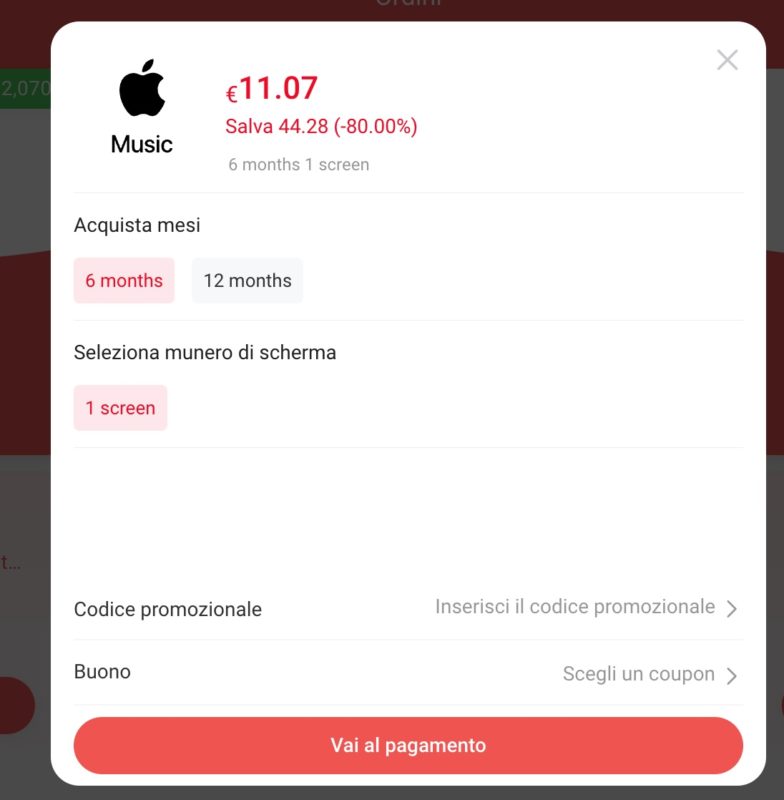 - scegli l'abbonamento a Apple Music tra i tanti proposti: puoi scegliere quello da 6 mesi a 11€ oppure da 12 mesi a 17€