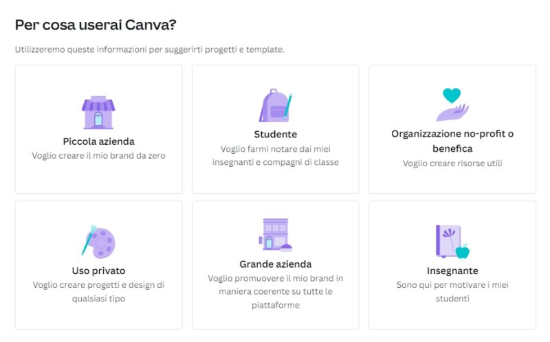 vai su Canva e crea un nuovo account con la mail appena creata