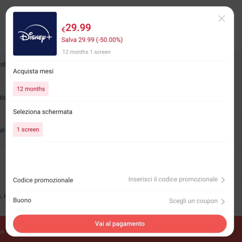 - scegli l'abbonamento a Disney+: al momento è disponibile solo quello che dura 1 anno, al prezzo di 30 euro
