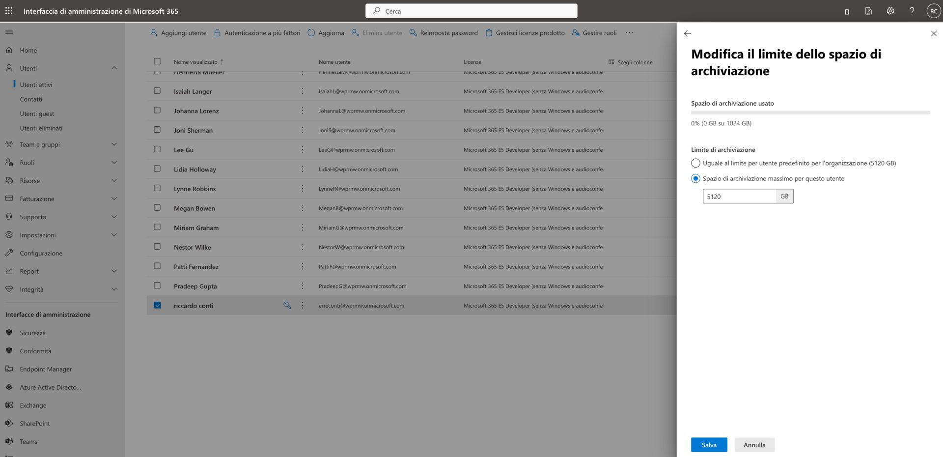 - Clicca quindi sulla voce Impostare il limite di archiviazione predefinito per gli utenti e digita il valore 5120 GB. Salva il tutto