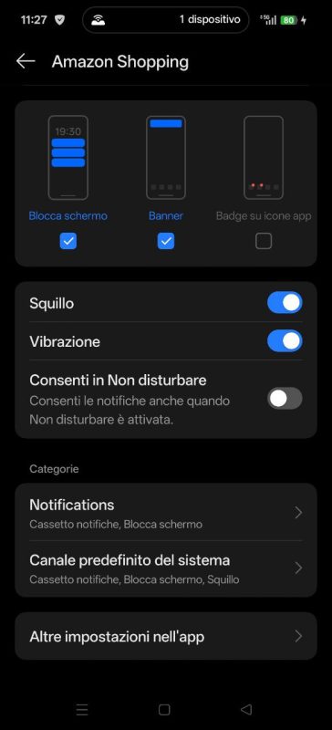 Dalle Impostazioni di Android, infatti, potevo solo attivare o disattivare tutte le notifiche dell'app di Amazon, ma in quel modo avrei perso anche quelle relative a ordini e spedizioni, che dal mio punto di vista sono molto utili.