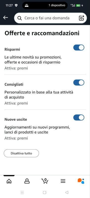 Ho quindi fatto una ricerca nel mio account Amazon, sia nell'app che online, ma non ho trovato nessuna voce o impostazione relativa alle notifiche.