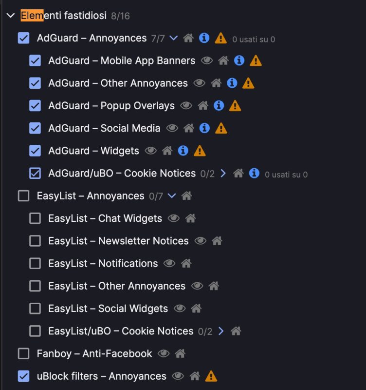 - Sotto alla voce "Elementi fastidiosi" abilita la spunta su "AdGguard - Annoyance" e su "Ublock filters -Annoyance"