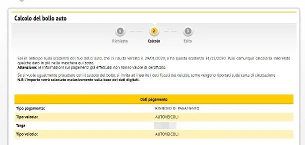 NOTA: se il pagamento del bollo è stato fatto mediante soggetti che non sono connessi agli archivi ACI, il dato relativo all’avvenuto pagamento potrebbe non essere visibile