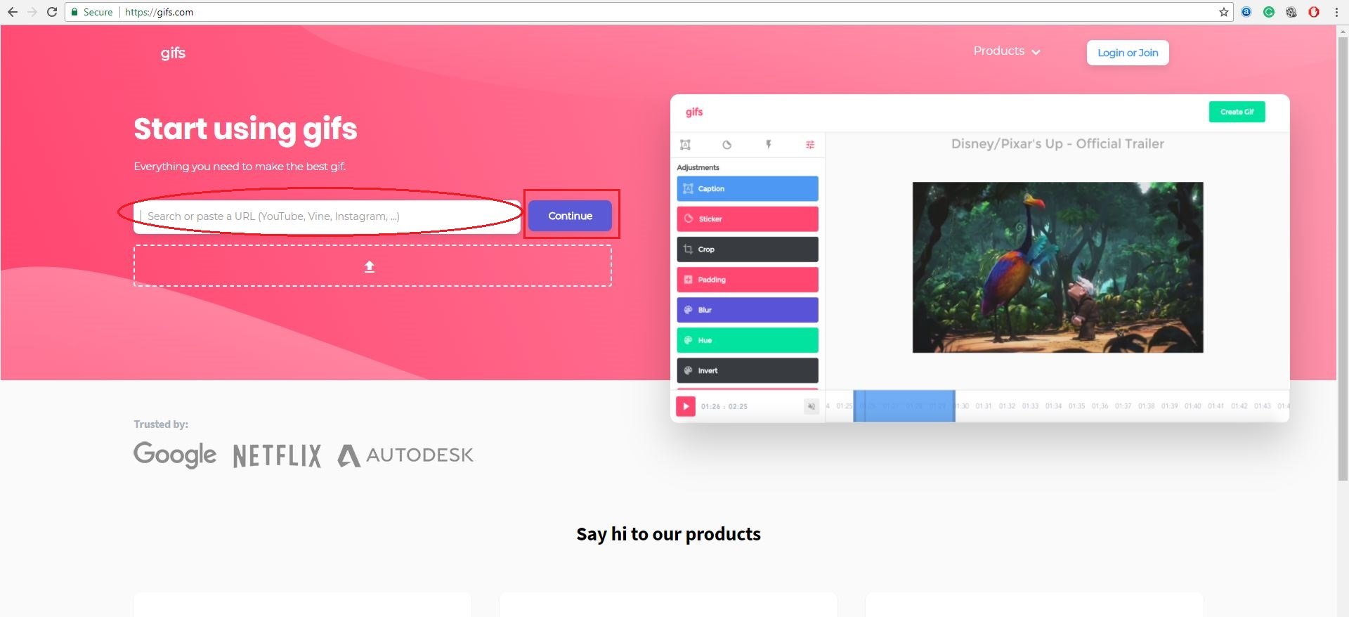 Step 1: copia il link del video di YouTube che vuoi usare per creare la GIF e incollalo nell'apposito spazio del sito GIFS.COM poi premi su Continue