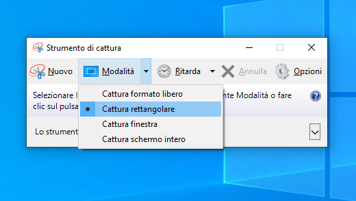 - Per scegliere il tipo di cattura desiderato, premi i tasti ALT+M e usa i tasti di direzione per scegliere Cattura formato libero, Rettangolare, Finestra o Cattura schermo intero, poi premi INVIO. ALT+M è disponibile solo con l'ultimo aggiornamento di Windows 10. Quando crei una cattura rettangolare, tieni premuto MAIUSC e utilizza i tasti di direzione per selezionare l'area che vuoi catturare