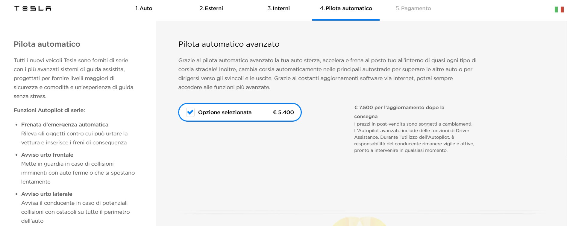 L'ultima scelta è sul pilota automatico avanzato che vi costerà ben 5.400 euro in più se fatto al momento dell'acquisto dell'auto, altrimenti dopo vi costerà 7.500 euro, ben 2.100 euro in più.