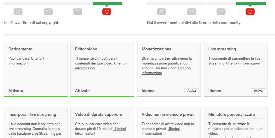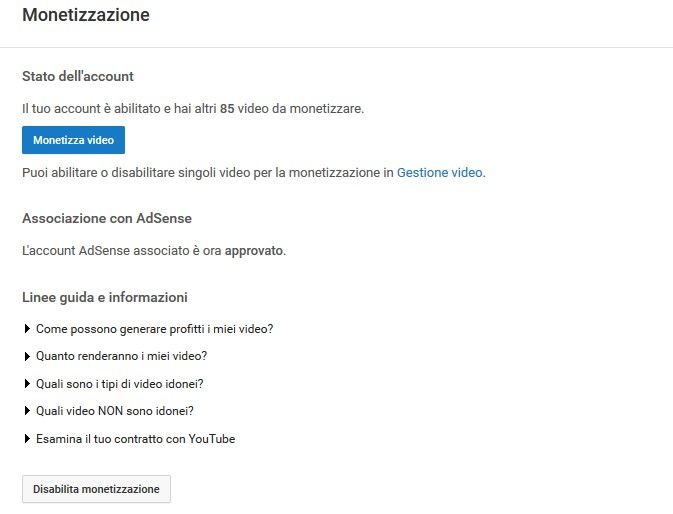 Stato dell'account ed abilitazione video alla monetizzazione