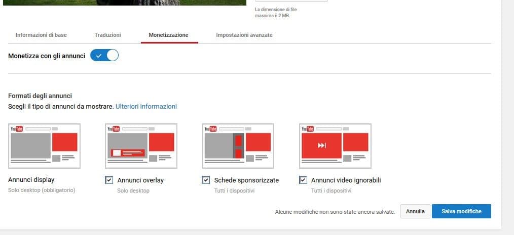 Una volta selezionati la tipologia di annunci, vi consiglio tutti e tre, cliccate su Salva modifiche per iniziare a guadagnare con i vostri video di YouTube.