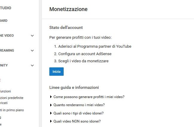 Ora, inizierete la configurazione del vostro account, cliccando su Inizia potrete configurare l'account YouTube e collegarlo al vostro account AdSense. In basso sono anche presenti le Linee guida e informazioni su come generare profitti dai video di YoTube ed altri consigli.